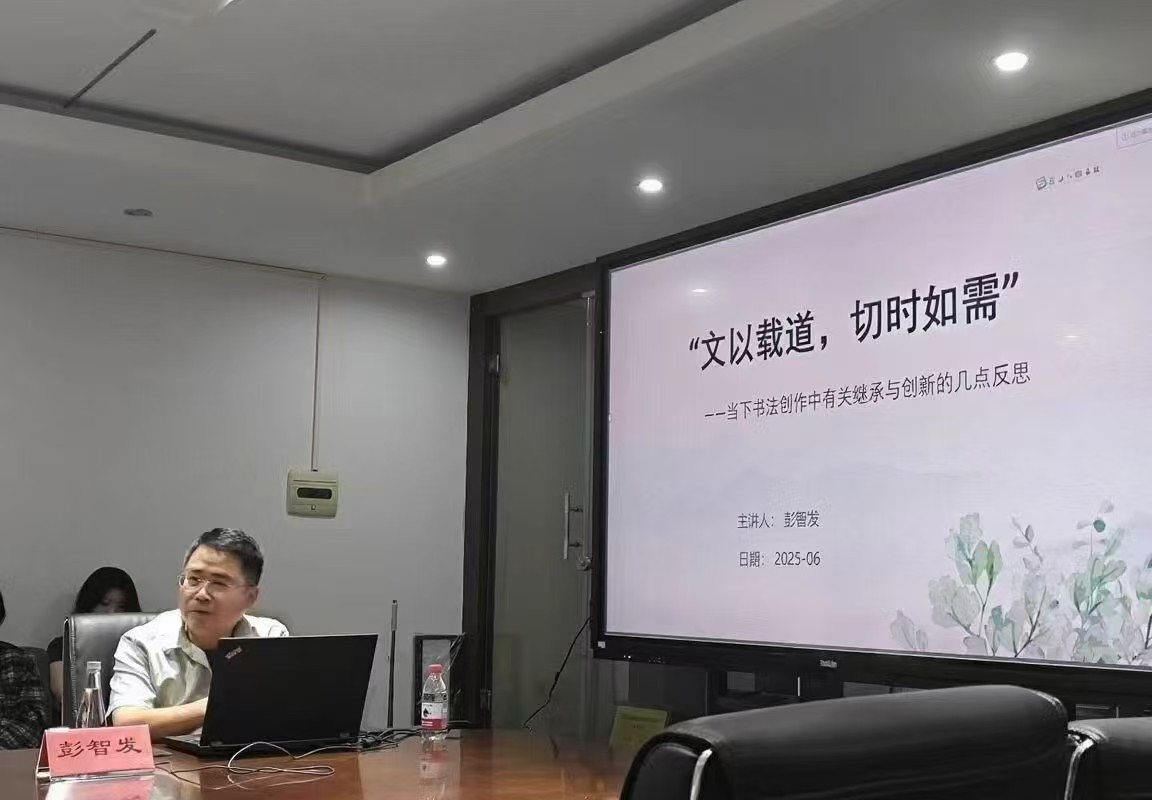 2025年6月16日,美术与设计学院邀请赣南师大北京校友会会长、中国书法家协会会员彭智发先生给学院师生们做了一次深入浅出、案例丰富、生动鲜活的书法讲座。讲座由副院长罗春辉主持,各专业中青年教师、研究生及本科生共50余人听取了本次讲座。